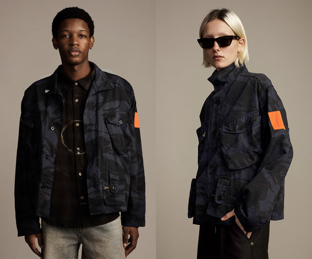 We recut the shape into a unisex block and referenced classic British camouflage, then overdyed it in a deep indigo to mute and recalibrate the pattern. The high collar was exaggerated, pushing the military reference into something more personal. The orange arm patch sits as a deliberate interruption. A mark of intervention.