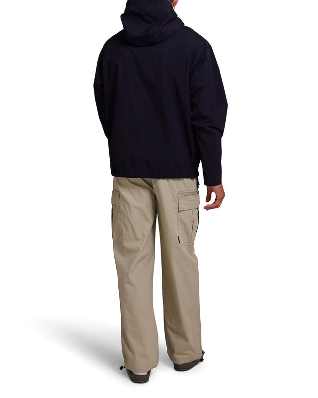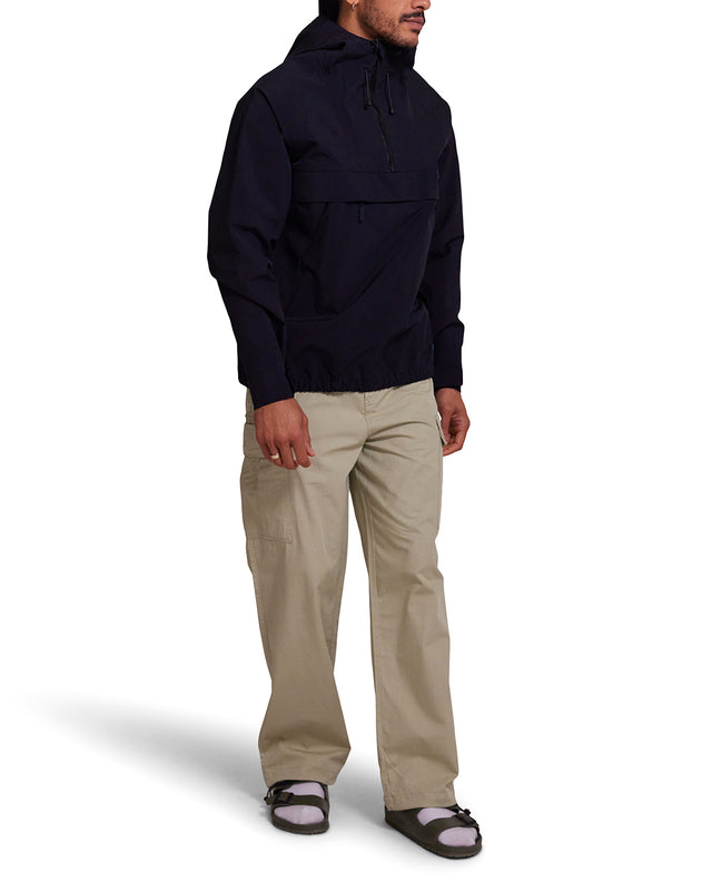 Relaxed fit waterproof smock anorak with hood, lower front branded label, aqua seal zips at neck and side seam, lower front zip pockets and drop pouch centre front zip pocket, elasticated adjustable draw cords at hood and hem, cordura nylon fabrication with waterproof jersey backing and taped seams